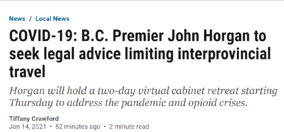 此外,据《温哥华太阳报》报道,省长贺谨1月14日将在线上进行省政府内阁会议,目前正在寻求法律意见以限制省际旅以应对疫情大流行。省长表示,目前省民非常担心来自加拿大其他省份的人把新冠病毒带到BC省来。