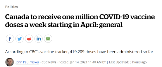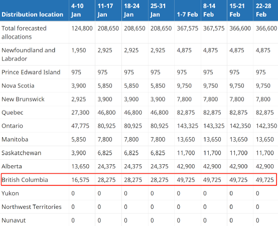 能办到吗?显然不能。BC省前面可还有安大略省和魁北克呢。以辉瑞疫苗为例,按照加拿大目前公布的数据,BC省的配额只有疫苗总量的13%。也就是说,满打满算4月BC省每周能接种到“50万周目标”的三分之一就不错了。