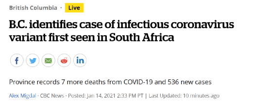 Henry博士承认,目前尚不清楚该南非变异病毒的传染源,但她同时指出,目前这一变异毒株尚未在社区中传播。此外,BC省目前已在本省境内发现4例感染英国新冠变异病毒的省民。其中3个变种病例与1名旅行者有关,而第4例与另一名旅行者相关。