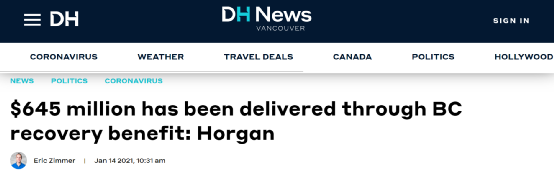 为所有单身省民一次性发放500加币,为所有BC省家庭发放1000加币,这是BC省新民主党党领、省长贺谨(John Horgan)在2020年竞选时做出的承诺。