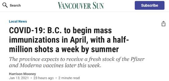 据《温哥华太阳报》1月13日报道,BC省即将于4月启动大规模接种运动,从今年夏天起计划每周为近50万省民接种新冠疫苗。