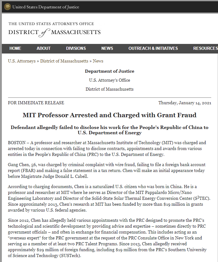 当地时间1月14日,美国司法部官网消息显示,美国工程院院士、麻省理工学院(MIT)教授陈刚因未能向美国能源部披露其在中国的工作和获得的奖励而被起诉和逮捕。
