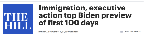 “我承诺过,在上任后的100天内,我将向美国参议院提交移民法案,为美国超过1100万无证件人士提供成为美国公民的途径,”美国当选总统拜登2020年11月24日对美国《国会山报》如是表示到。