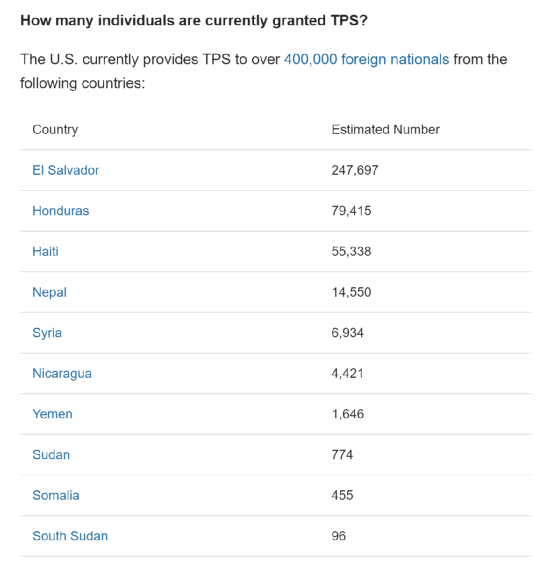 据美国移民论坛(National Immigration Forum)数据显示,目前有超过40万外国公民在美国享受TPS身份。