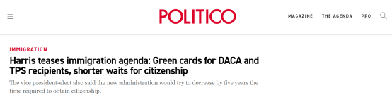 1月13日,美国当选副总统贺锦丽(Kamala Harris)在接受哥伦比亚裔记者Ilia Calderon采访时表示,拜登政府在上台后将立即推动移民改革。相关法案将立即(immediately)为临时保护身份(TPS)获得者和“梦想生”(童年抵美暂缓遣返人员)发放绿卡。