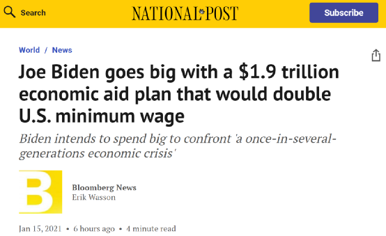 据加拿大《国家邮报》(National Post)转载彭博社报道,美国当选总统拜登1月14日公布了自己制定的、花费将高达1.9万亿美元