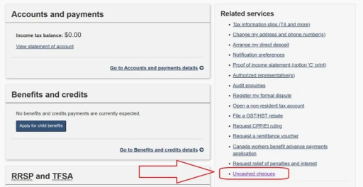 6个月以上没有认领的款项都会在这个页面上列出,并附有索取款项需要的表格;详情请浏览https://www.canada.ca/en/revenue-agency/services/uncashed-cheque.html。