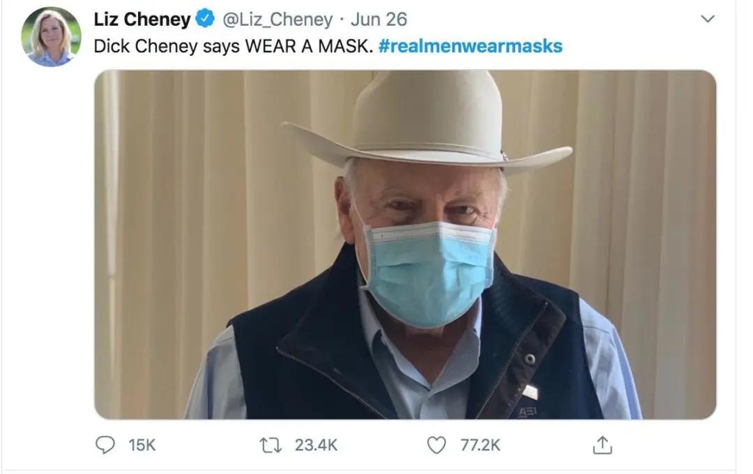 丽兹·切尼抨击了川普的疫情处理。她推特上传了一张老切尼戴口罩的照片,附带标签#realmenwearmasks(真男人戴口罩),被解读为讽刺川普拒绝戴口罩的行为。