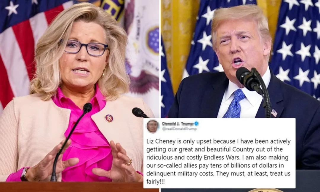 川普上任来一直推行从各地撤军的行为,这引发了丽兹·切尼的强烈批评。对此川普回呛:“丽兹·切尼对我的撤军提议感到沮丧,是因为我想让我们伟大的国家从荒唐昂贵的无尽战争中摆脱出来。”直指老切尼发动的伊拉克战争。