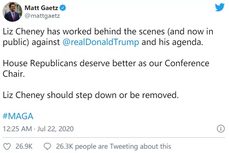 佛罗里达众议员Matt Gaetz是川普铁杆中的铁杆,忠诚指数高举全党第三,在推特了呼吁丽兹·切尼下台