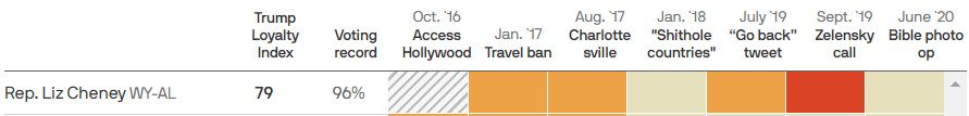 而丽兹·切尼的表现对川普还是比较不错的。在我们之前提过的川普七大争议时刻(传送门:离下台只剩七周,回顾川普的七大争议瞬间)中,有四次丽兹·切尼都力挺川普。在众议院投票记录中,丽兹·切尼有96%的投票都和川普立场一致。