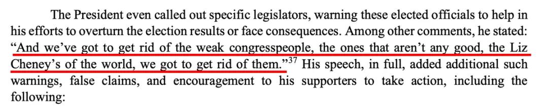 1月6号中午,丽兹·切尼正在国会发言;而同时川普发表了讲话,点名道姓攻击了丽兹·切尼,说:“我们要将那些糟糕软弱的共和党议员赶下台,就是丽兹·切尼那样的人!”