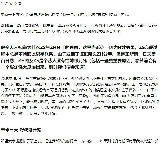 紧接着知乎上又有爆料称,郑爽之所以和张恒分手是因为劈腿H姓男星,还提到了一个时间点:春节前。