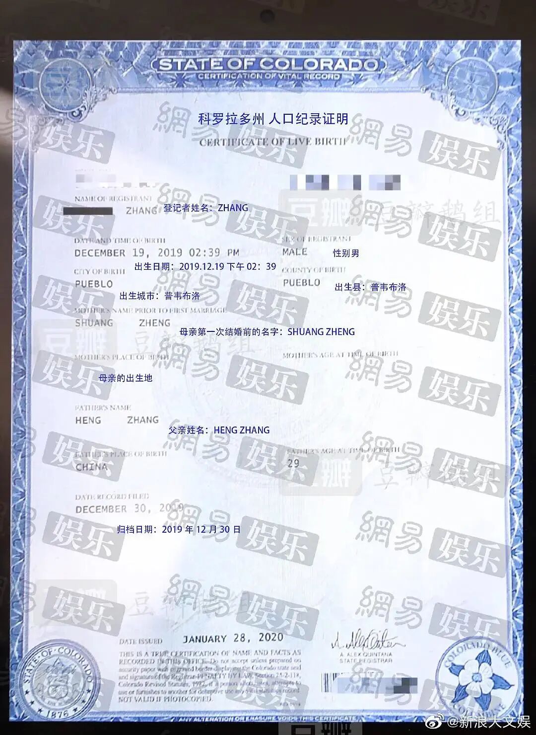 一份《科罗拉多州人口记录 出生证明》显示: