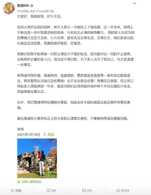 原来中国知名流量女星郑爽的前男友张恒,突然发了一条微博站出来发声维权,称自己长期被黑被诽谤,心力交瘁甚至无法进行正常的社交生活。