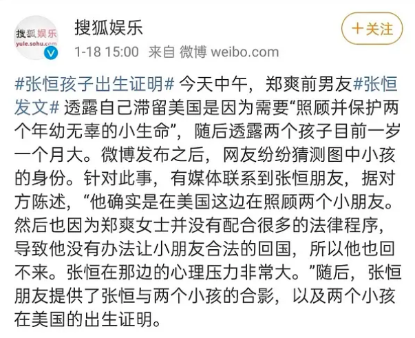 而据搜狐娱乐的报道,郑爽不签字走法律程序,张恒没有办法只能滞留美国照顾两个孩子……