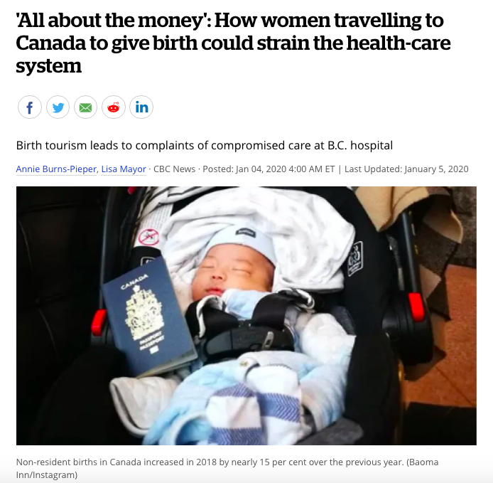 加拿大CBC News就曾曝光,在本就医疗资源不充裕的BC省列治文市医院,2018年双非婴儿的出生率比前一年激增15%,挤占了本地人的资源,并且其中还有一些妈妈甚至没支付住院费用就走了;美国也于2020年1月23日出台法律,如签证官判断申请者出于旅游生育目的赴美,则将拒绝发放签证。