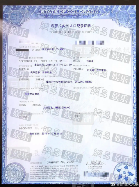 另外一份《科罗拉多州人口记录-出生证明》,上面则显示男婴出生时间为2019年12月19日,母亲在第一次结婚前的名字为“SHUANG ZHENG”,婴儿出生时母亲的年龄和母亲出生地未显示;父亲姓名为“HENG ZHANG”,父亲出生地中国,年龄29。