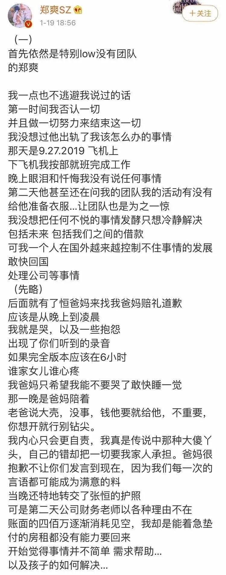 全文核心应该是正文第四句,大意为“郑爽称张恒出轨”。