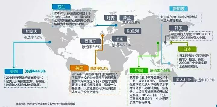 作为未来人工智能时代的必备技能,家长们十分鼓励孩子从小学习编程,其他发达国家更是如此。在日本,像加藤周这样的编程少年其实并不在少数, 2012年起,日本在中小学中开始普及编程教育科目。美国 K12 阶段约有超过1200万的孩子已接受在线编程教育。据2017年一项报告称,少儿编程在美国的渗透率最高,达到44.80%(现在超过68%),英国为9.31%,澳大利亚、加拿大等国家也都在10%左右。