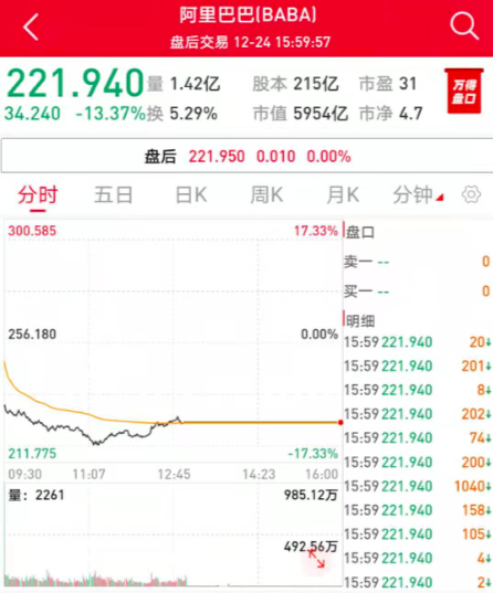 去年12月24日,新华社报道称,近日市场监管总局根据举报,依法对阿里巴巴集团控股有限公司实施“二选一”等涉嫌垄断行为立案调查。受阿里被调查影响,阿里巴巴股价当天大跌13.37%,市值一夜蒸发超900亿美元。