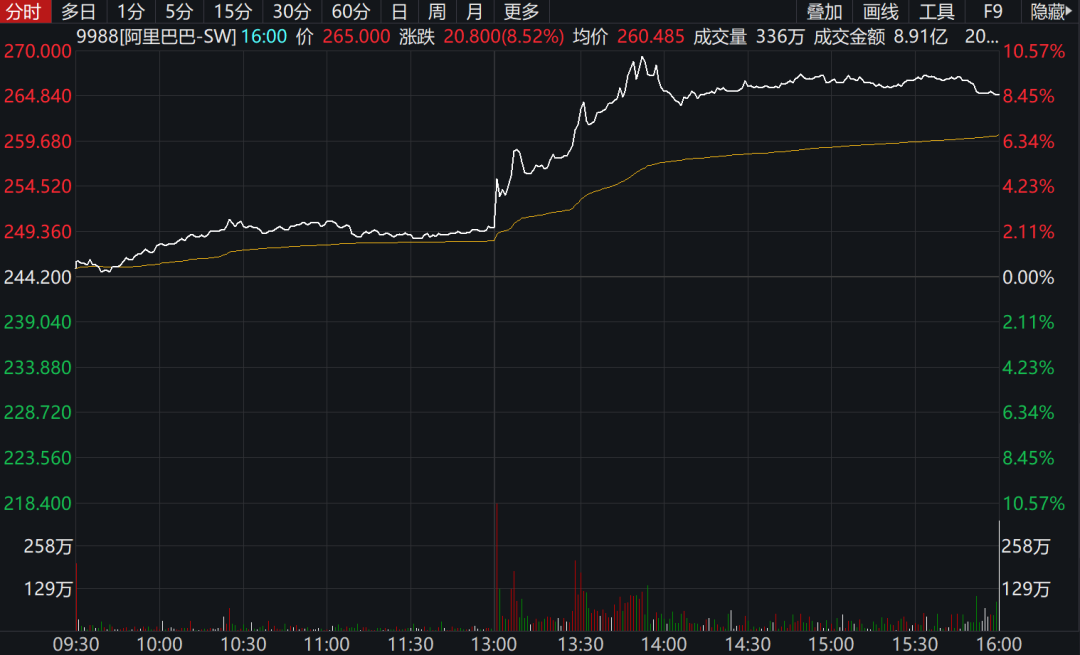 阿里巴巴午后开盘直线拉升,一度涨近10%至269港元,股价创去年12月11日以来新高,市值超5.5万亿港元。
