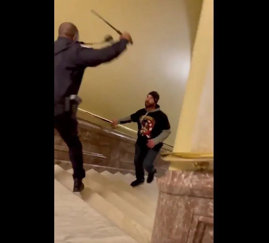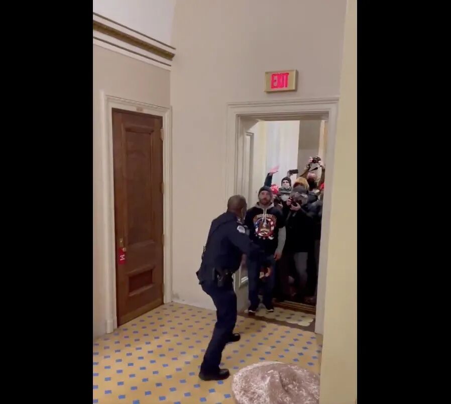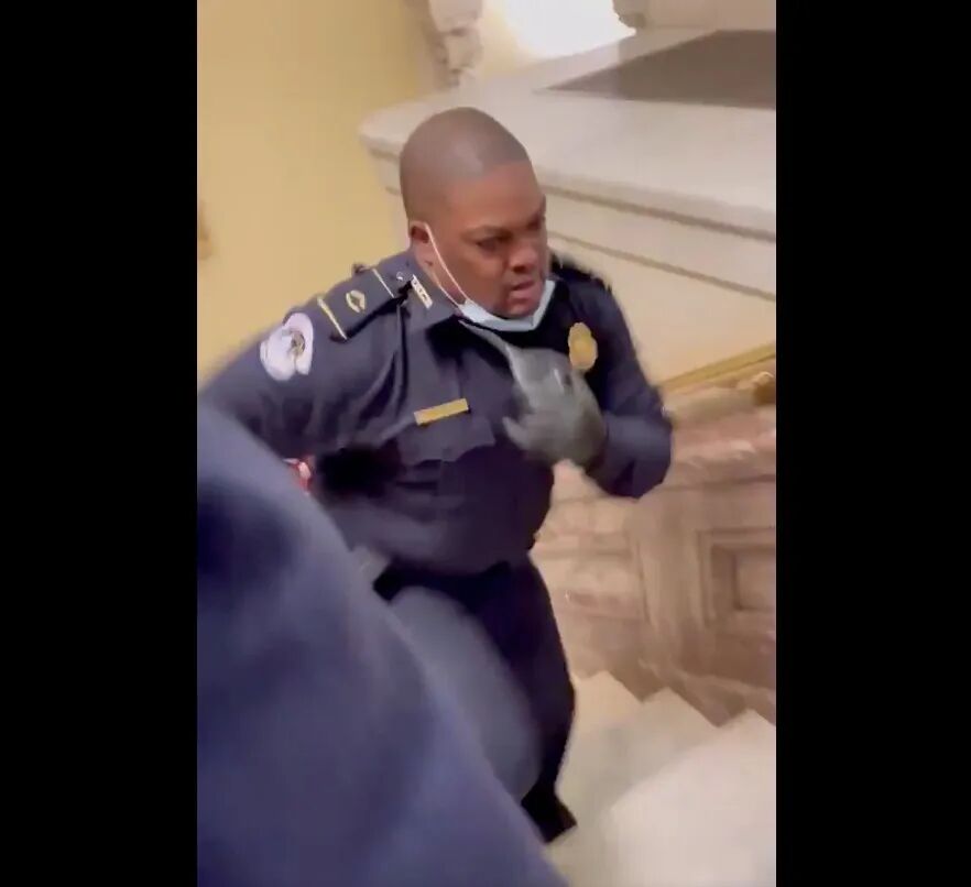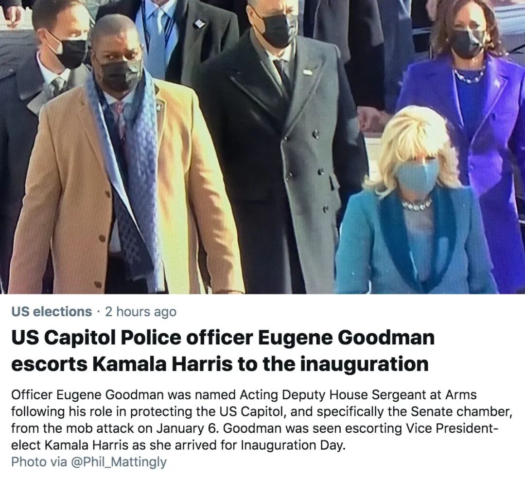 左边这位穿驼色大衣的黑人男子就是国会山那天的“英雄”警员Eugene Goodman,由于他出色而英勇的表现,现在升任了副军士。