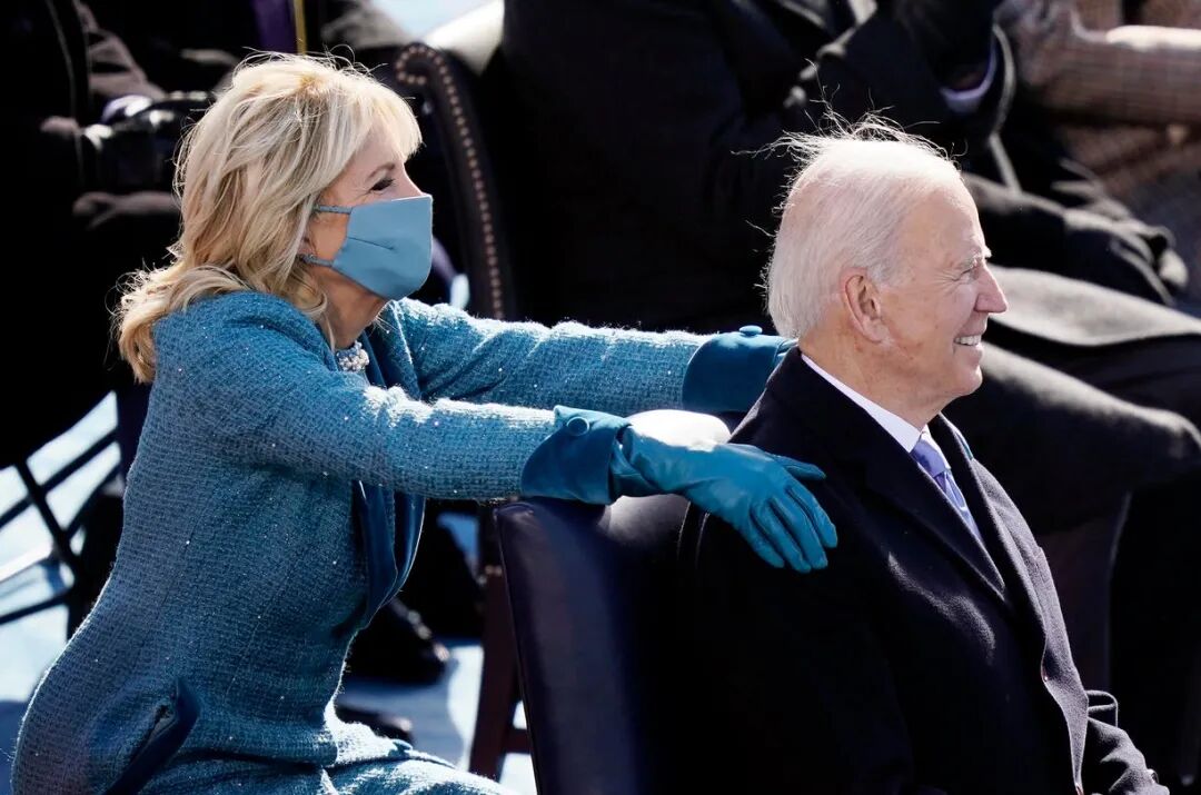 20号的就职仪式上还有一些令人动容的瞬间,比如第一夫人吉尔·拜登以一身象征“信任、自信及稳定”的水蓝色套装陪同拜登一同出席就职仪式,传达了拜登政府对未来四年的美好愿景。