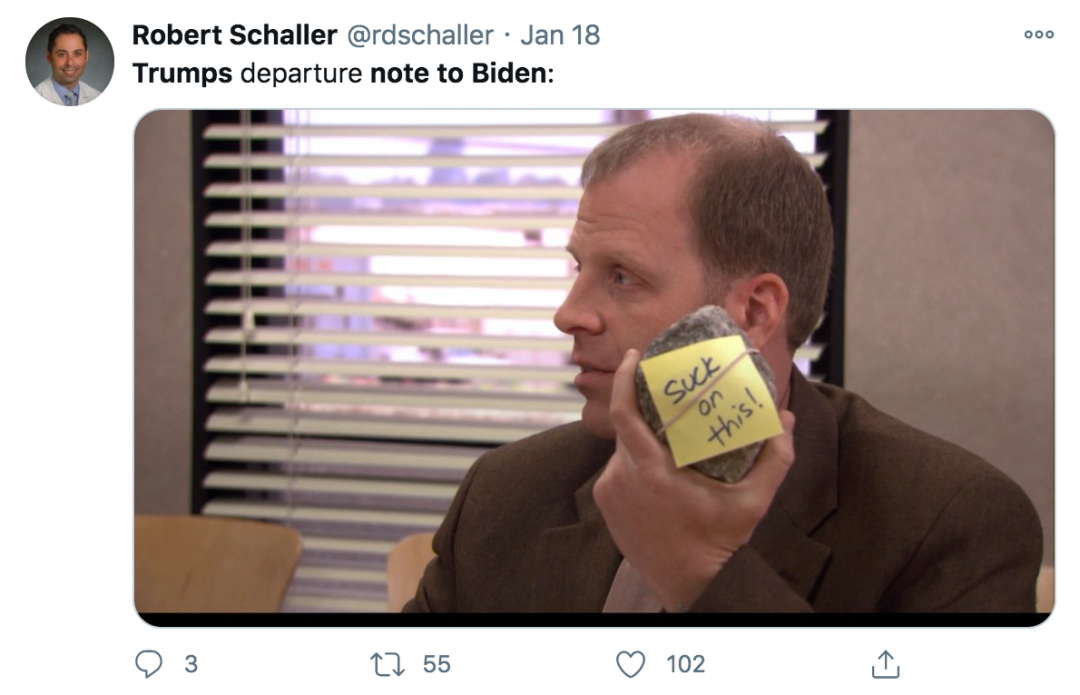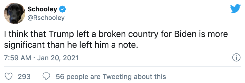 就像有网友一针见血地指出:特朗普留给拜登的小纸条上到底写了什么不重要,重要的是他留下了一个烂摊子给拜登去收拾。