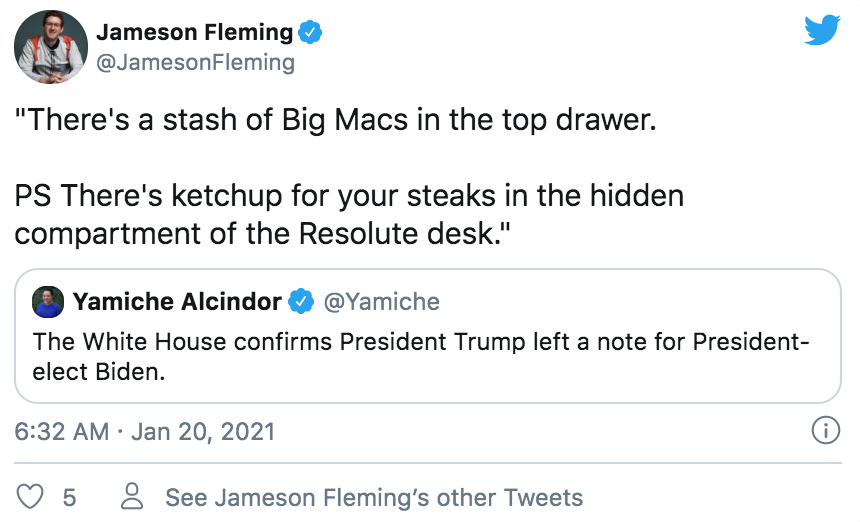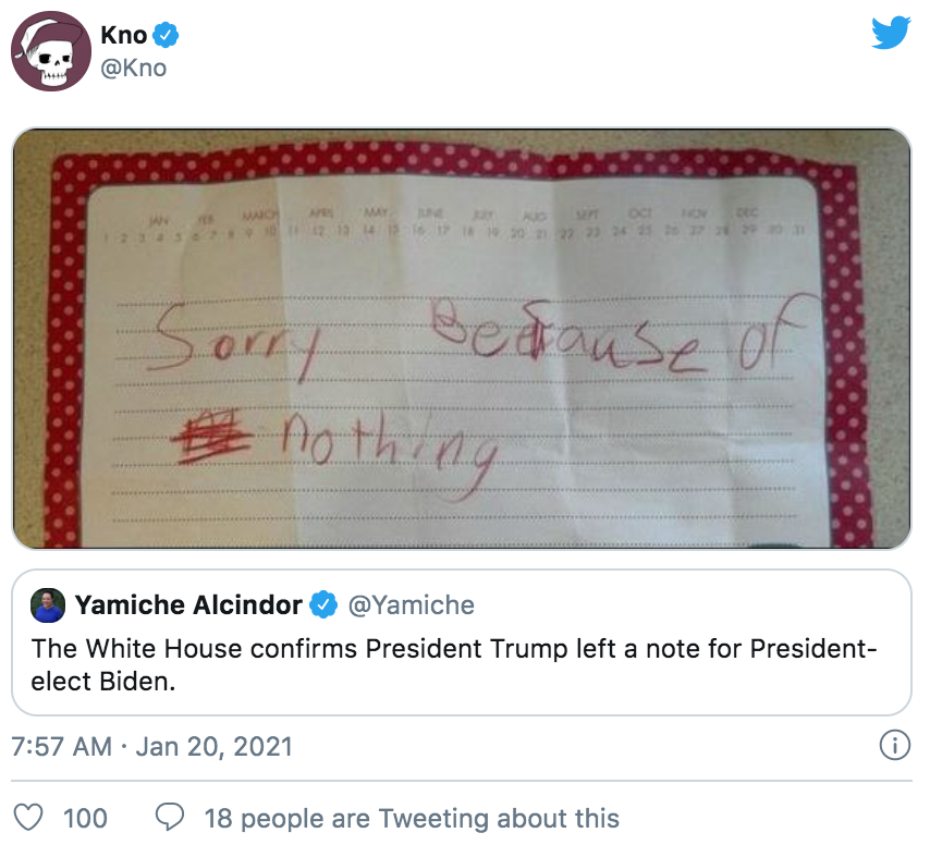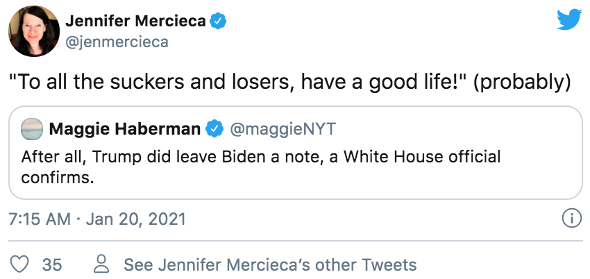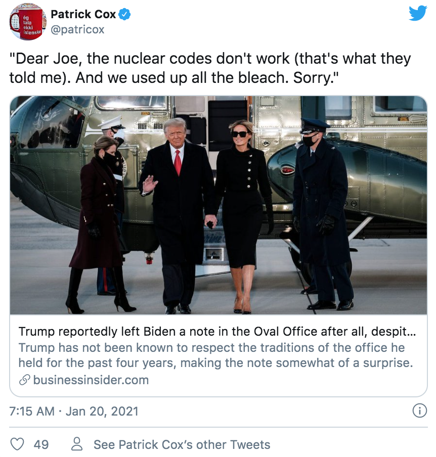 不仅特朗普拒绝出席交接典礼,梅拉尼娅也没有按照以往惯例提前邀请拜登夫妇参观白宫。不过特朗普有一个举动引起媒体很大的好奇——他唯一按照惯例做的事就是留下了一张小纸条,放在白宫椭圆形办公室的桌子上给拜登。而据彭博社驻白宫的记者透露,梅拉尼娅和副总统彭斯也分别给继任者留了言,并且,特朗普和梅拉尼娅的那两封还是找人代笔的。