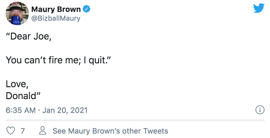 而正式成为前任的唐纳德·特朗普,拒绝出席交接仪式,与夫人梅拉尼娅在就职典礼开始前乘坐军方直升机前往安德鲁斯空军基地,在那里举行了简短的告别仪式,前往弗罗里达州的海湖山庄,开启退休后的生活。