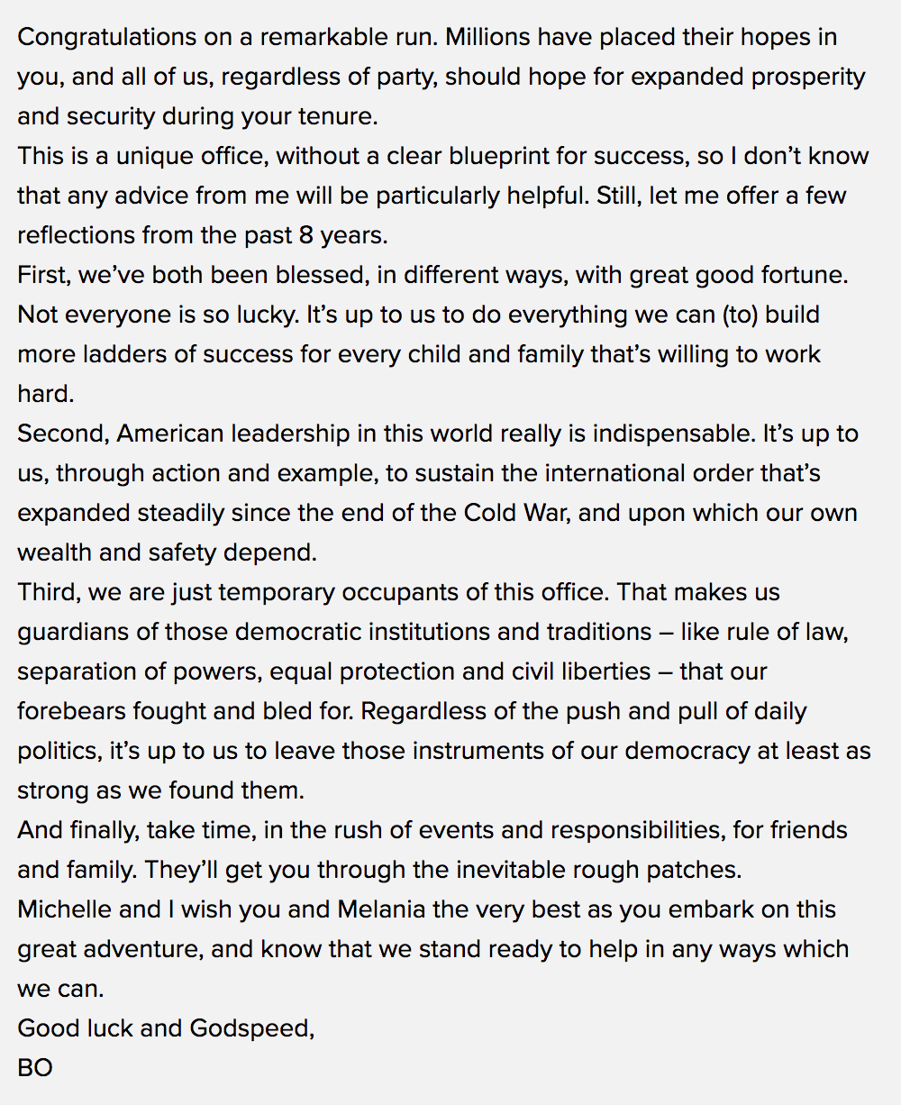 据美联社报道,从1989年里根总统开始,每一届美国总统上任时都会收到前任留下的小纸条,纸条上的内容在短期之内都是保密的,只有等到被录入国家档案后才会公布于众。这一次也不例外,美联社没有从前任白宫新闻秘书Judd Deere那里套出任何信息。