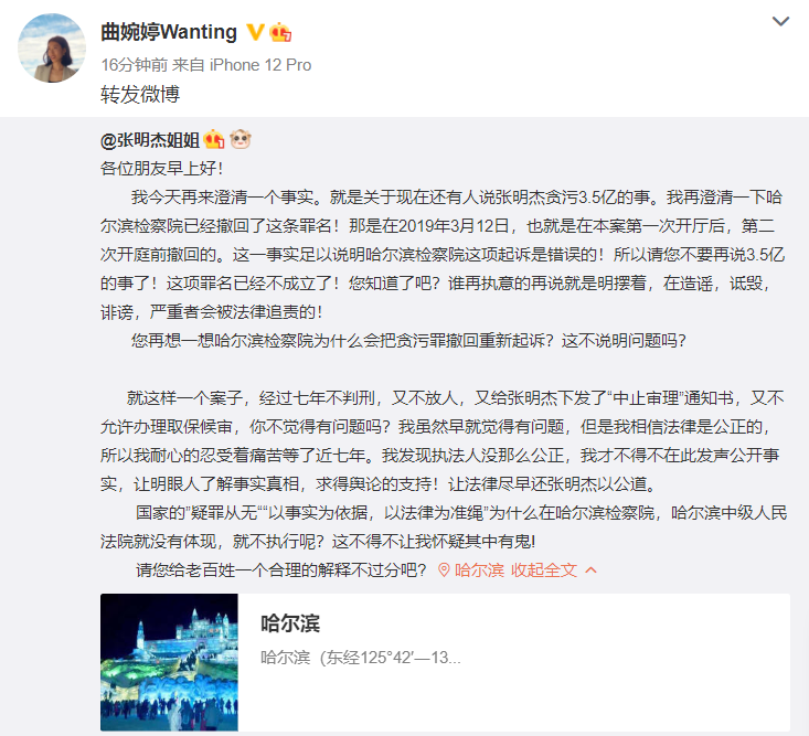 当天,曲婉婷转发了有关妈妈张明杰的澄清文章。张明杰姐姐在文内声称,现在还有人说张明杰贪污3.5亿的事,这一切实在是不可理喻,因为哈尔滨检察院早就已经撤回了这条罪名。
