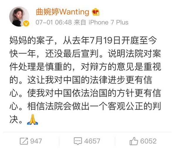 自从母亲张明杰被控贪污、受贿和滥用职权三项罪名被检方建议判死刑,以及和温哥华前市长罗品信分手后,曲婉婷似乎就鲜少出现在公众视野里。不过在母亲被关押期间,她至少两次在微博发声支援母亲。第一次在2017年7月间。