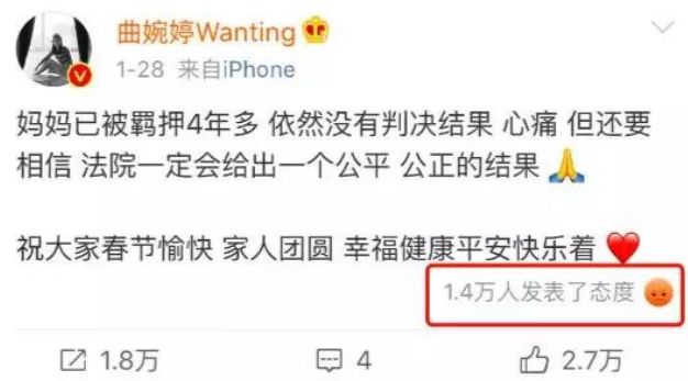 2019年年初,就在大家快要淡忘这件事时,曲婉婷又一次在微博发声称“妈妈已被羁押4年多 依然没有判决结果 心痛”,一时引发网友铺天盖地的群嘲。