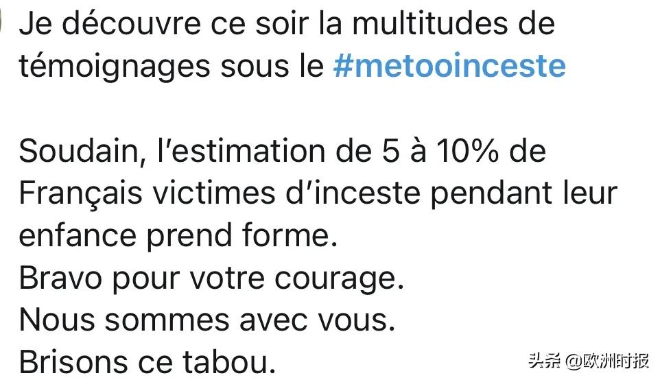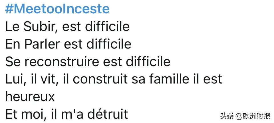 而引起更大反响的,莫过于推特上从上周六晚开始就发帖量猛增的话题:#metooinceste(我也被乱伦过),让人也不禁想起了几年前风的#metoo运动大浪潮。