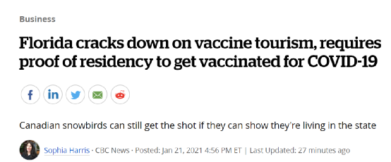据CBC报道,该命令得到了佛州州长Ron Desantis的支持。州长强调,虽然此命令禁止短期游客来佛州接种疫苗,但考虑到当地有不少季节性居民,来佛州越冬的“雪鸟族”以依旧可以在此地接种新冠疫苗。