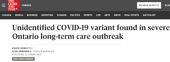 《环球邮报》称,经初步筛查,在该养老院检测出的这种新冠病毒,仅与英国、巴西和南非变种新冠变异毒株在基因突变上有部分相同。这也是首次有高度传染性的新冠变种病毒进入加拿大养老院,而老年人在新冠面前本就是易感人群。