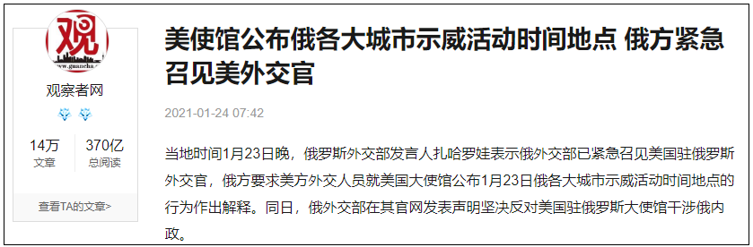 诡异的是,美国驻俄大使馆发布的游行信息,竟然早于示威游行的组织者,这引起了俄罗斯外交部的极大愤怒,俄罗斯外交部紧急招见美国驻俄罗斯外交官,警告美国大使馆不要干涉俄罗斯内政。己所不欲,勿施于人,俄罗斯断定这事是美国背后“捅刀子”,俄罗斯外交部发言人扎哈罗娃甚至用“歇斯底里般恐俄”这样的词汇指责美国,矛头直指拜登。
