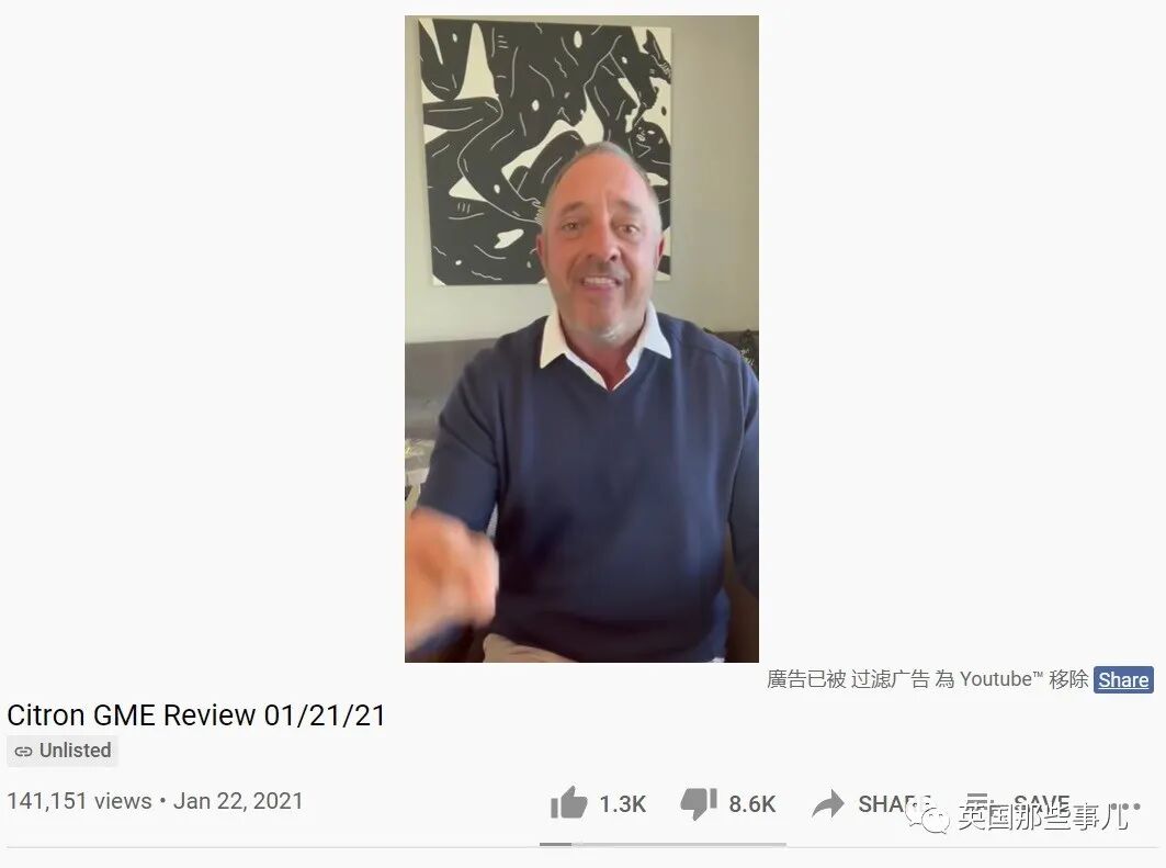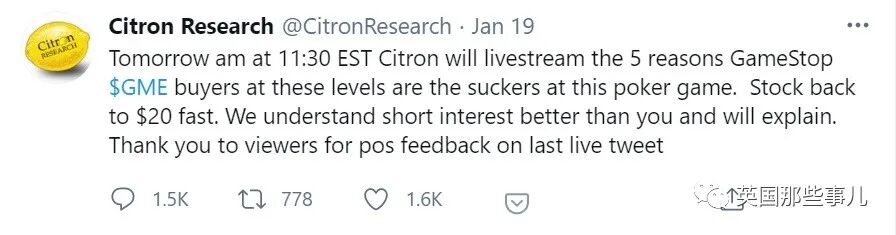 “明天上午11点半,香橼会开直播,列出GameStop的买家是蠢蛋的5大理由。牌都不会玩还上桌。股价会马上回落到20美元的。在做空上,我们比你们懂得多,到时候会解释。也谢谢在上场直播留下积极评论的人。”