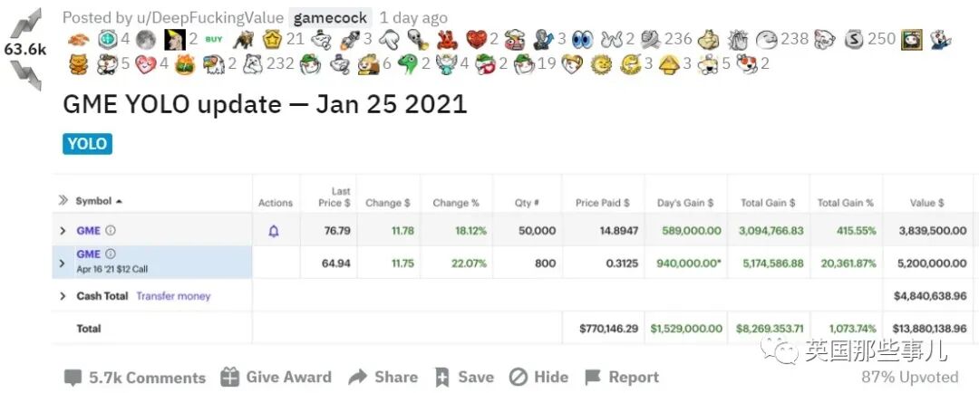 彭博社的专栏作家马特·莱文(Matt Levine)说,Reddit用户的这场大戏是“完全的虚无主义”,整件事“最好用一串火箭表情符号来讲述”。