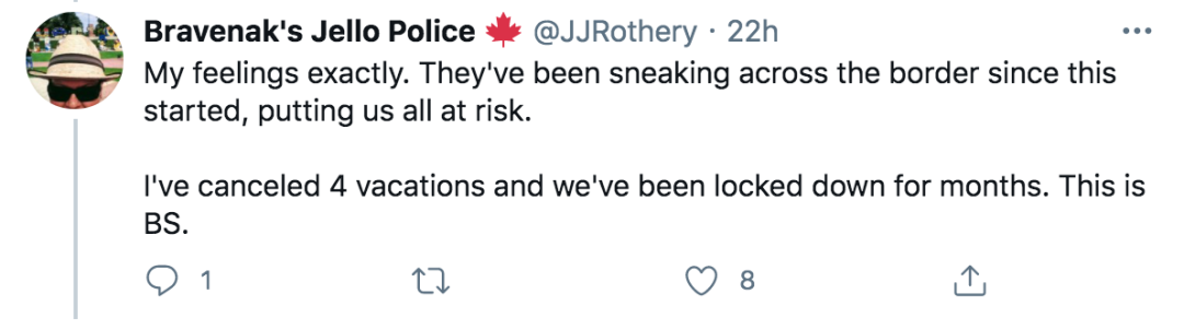 “他们从疫情一开始就一直在偷偷入境加拿大,把我们置于险境。我都取消了4个假期,在家封锁了好几个月,这真的很扯淡。”