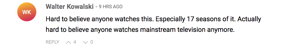 “现在还有人看这玩意儿?尤其是都出了17季了,再说现在谁还看电视?”(油管抖音不香么?)