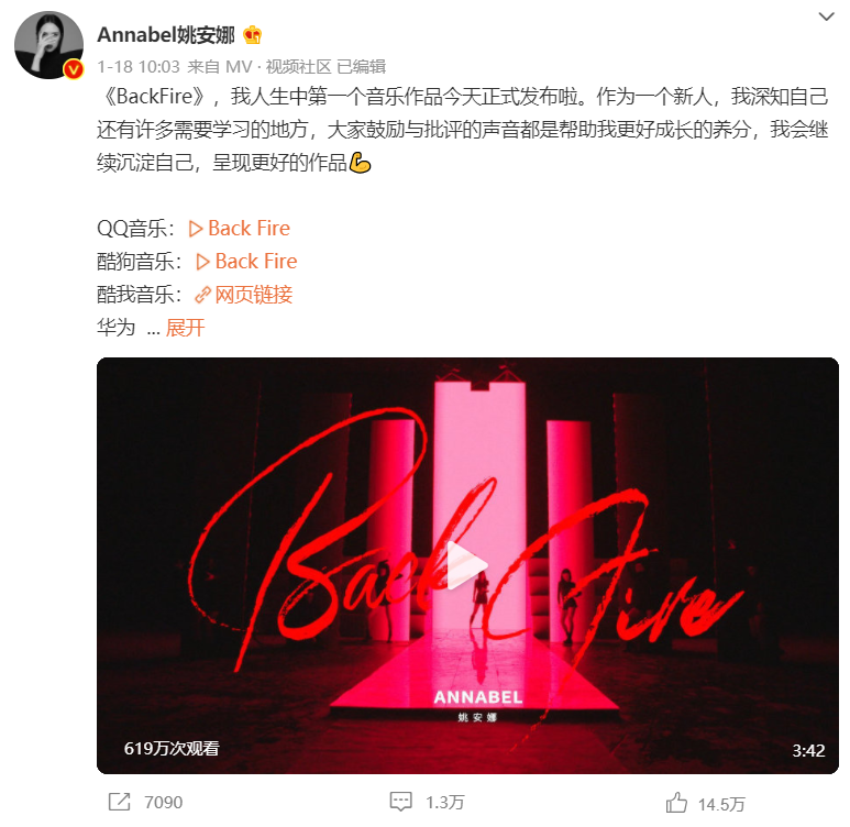 这首名叫《BACKFIRE》的个人单曲,一看就是为姚安娜量身定做的。