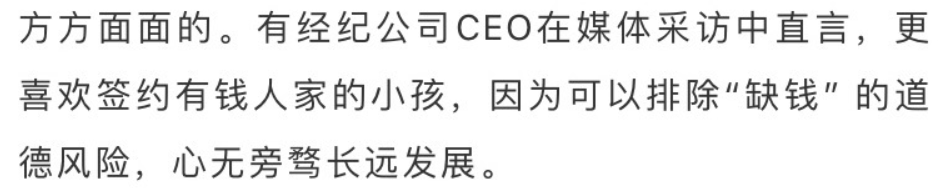 经纪公司也更愿意签约有钱人家的小孩,因为可以一起分担练习生期间的前期投入。