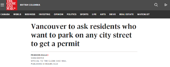 据《环球邮报》(Globe and Mail)1月27日报道,温哥华市政府正在按计划推行一项新政策,要求每个把车辆停靠在公共道路的市民向政府购买“停车证”(park permit)。
