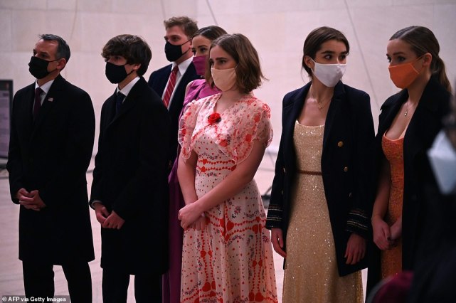 拜登夫妇共有四个孙女,都正值青春年华,因此每次集体出现也会格外吸引眼球,而且风格各异好似女团一般。最大的孙女娜奥米·拜登(Naomi Biden)27岁,梳着利落的短发,一副精明强干的女强人的感觉。芬尼根穿着橙色的亮片晚礼裙,有着比实际年龄更加成熟的感觉。19岁的梅西·拜登(Maisy Biden),可能是姐妹中最具个性的一位,穿着漂亮的碎花裙却选择搭配一双高邦运动鞋,发型也是与众不同。16岁的纳塔利·拜登(Natalie Biden),是前三位的堂妹,她是第46任总统已故长子博·拜登的女儿,同样也是位很漂亮的女孩,虽然还是未成年,但脸上却也没有什么稚气的感觉。纳塔利和芬尼根一样,都选择了来自马卡林(Markarian)的亮片礼服裙,这个2017年才创立的品牌,因为受到拜登家女眷的宠爱,一时间成为了时尚达人们关注的对象,拜登夫人在就职典礼上所穿的蓝色套装,也是马卡林的作品,属于高级定制,大约为3.6万RMB。