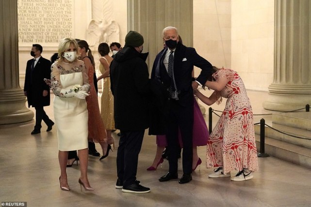 当地时间1月21,美国新任总统乔·拜登带领着家人及副总统夫妇,在位于白宫内的国家宴会厅参加了虚拟就职祈祷。原本这项活动应该在华盛顿国家大教堂内进行,但因为处于非常时期,因此改为了在线进行,即便如此,在宴会厅内的所有人也都佩戴着口罩。刚刚成为第一夫人的吉尔·拜登穿着深红色的连衣裙亮相,而不远处的副总统卡玛拉·哈里斯则选择勃艮第色,不过画面中最亮眼的,莫过于坐在吉尔身后的芬尼根·拜登(Finnegan Biden),21岁的大四女生的坐姿实在有趣,高难度的二郎腿,展示出相当不错的柔韧性,大有每时每刻都要练习瑜伽的感觉。