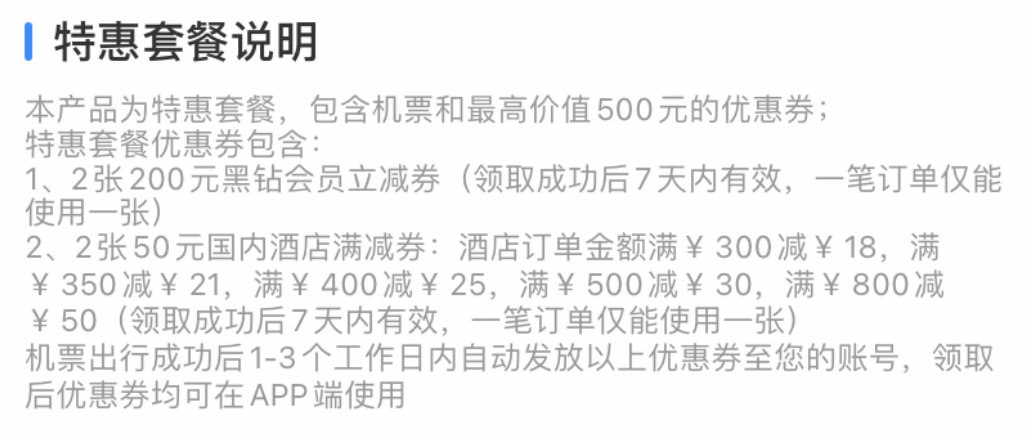 好家伙,这个票价跟其他平台完全相同,他不说我还真没发现自己买的是特惠套餐。而这个所谓的特惠,实际上并不是给机票本身降价,而是送了一堆有的没的的酒店满减券。