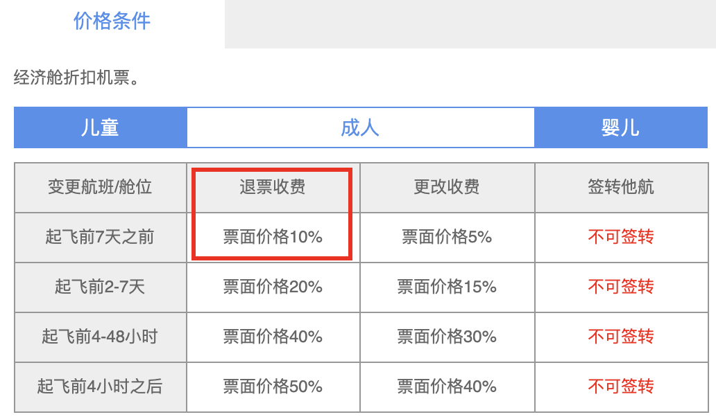 即使是买最便宜的廉价机票,同航班最高的退票收费,也只是票面价格的 10% 。